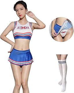 YAISHN チアガール スク水 コスプレ セクシー スカート スクール水着 体操着 背中空き レディース ランジェリー Tバック ニーハイソックス付き 4点セット (ブルー)