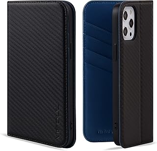 VISOUL iPhone 12Pro Max ケース 手帳型 本革レザー 全面保護 マグネット式 カード収納 アイフォン12Pro Maxケース 横置きスタンド機能付き手帳型ケース 2020年発売 iphone 12ProMax対応 6.7インチ カーボンレザー ネイビー
